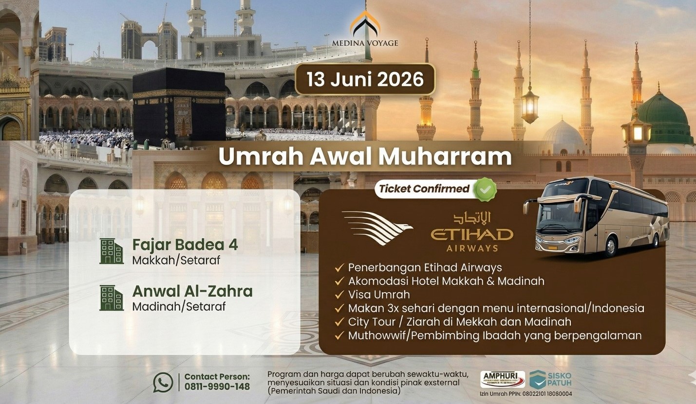 Hari Ke-1JAKARTA – ABUDHABI EY0473 00.45 – 05.50 Jamaah berkumpul di Lounge Bandara pukul 19.00 WIB di tgl 12 Jun 2026, ABU DHABI – JEDDAH EY0615 08.35-10.35. emudian jamaah bersiap kembali melanjutkan penerbangan menuju Jeddah, take off pukul 08.35 AST.Tiba di Jeddah pukul 10.35 AST dilanjutkan dengan proses imigrasi dan pengambilan bagasi. Setelah selesai jamaah bersiap naik bus, dan melanjutkan perjalanan ke Kota Madinah.